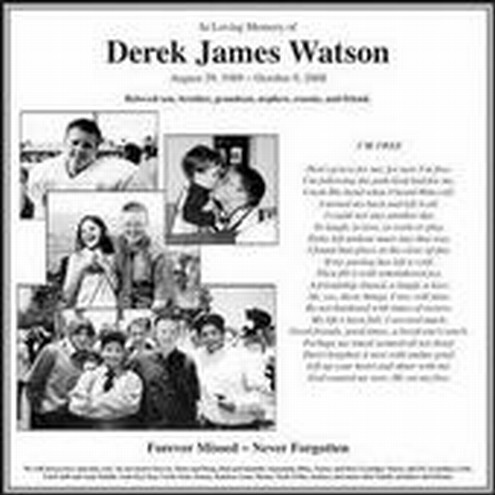 |  | Derek, I love and miss you everyday.  I think of all the memories that we will no longer share.  I miss you! |